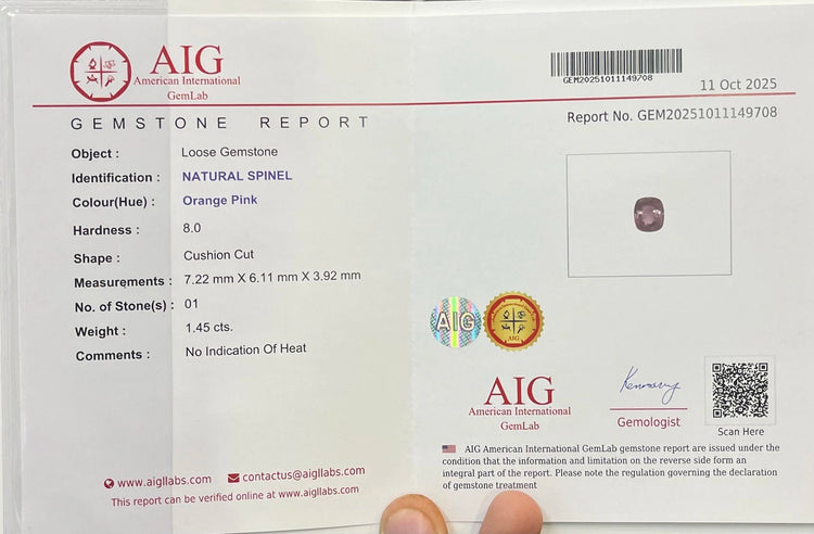 Discover the beauty of this 1.45-carat Natural Spinel, showcasing a stunning orange-pink hue paired with excellent lustre and clean transparency. This vibrant gemstone is fully AIG certified, guaranteeing authenticity and natural origin.