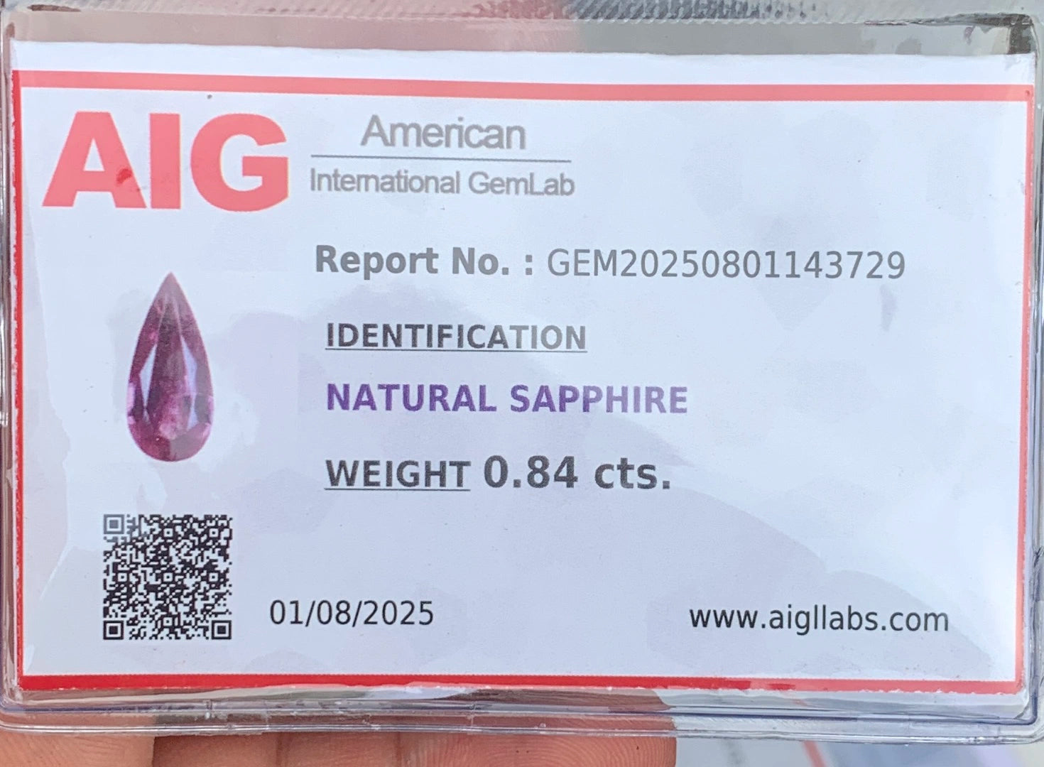 This sapphire is unheated and untreated, retaining its natural color and integrity. It is certified by AIG (American International Gemlab), ensuring authenticity and verified gemstone quality.