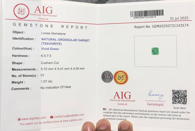 Expertly fancy-cut to maximize light reflection and fire, it displays VVS clarity, revealing near-flawless transparency and lively sparkle. Certified by AIG, and completely untreated, this gem represents the pinnacle of natural beauty — perfect for fine jewelry or collectors seeking high-grade Tsavorites.