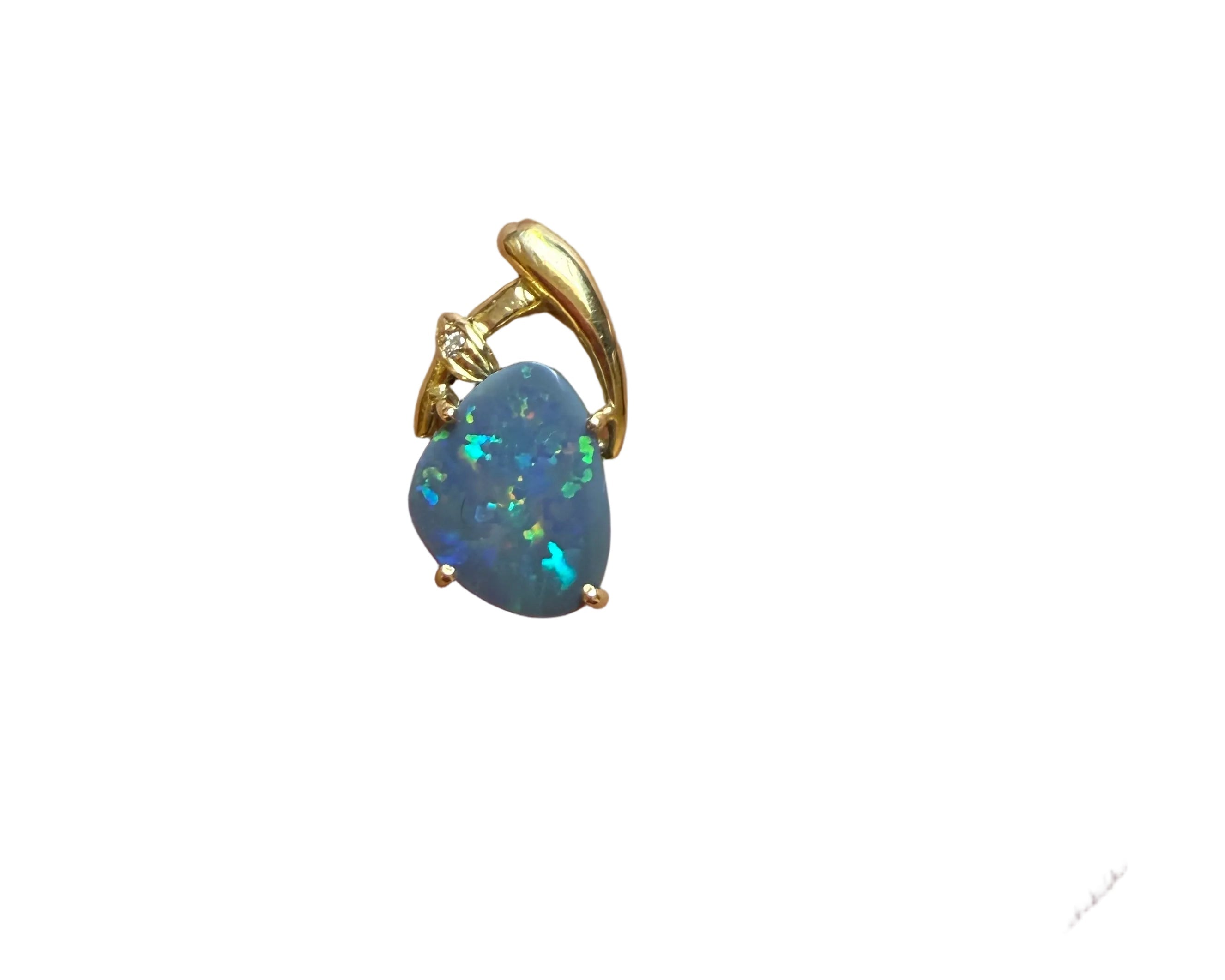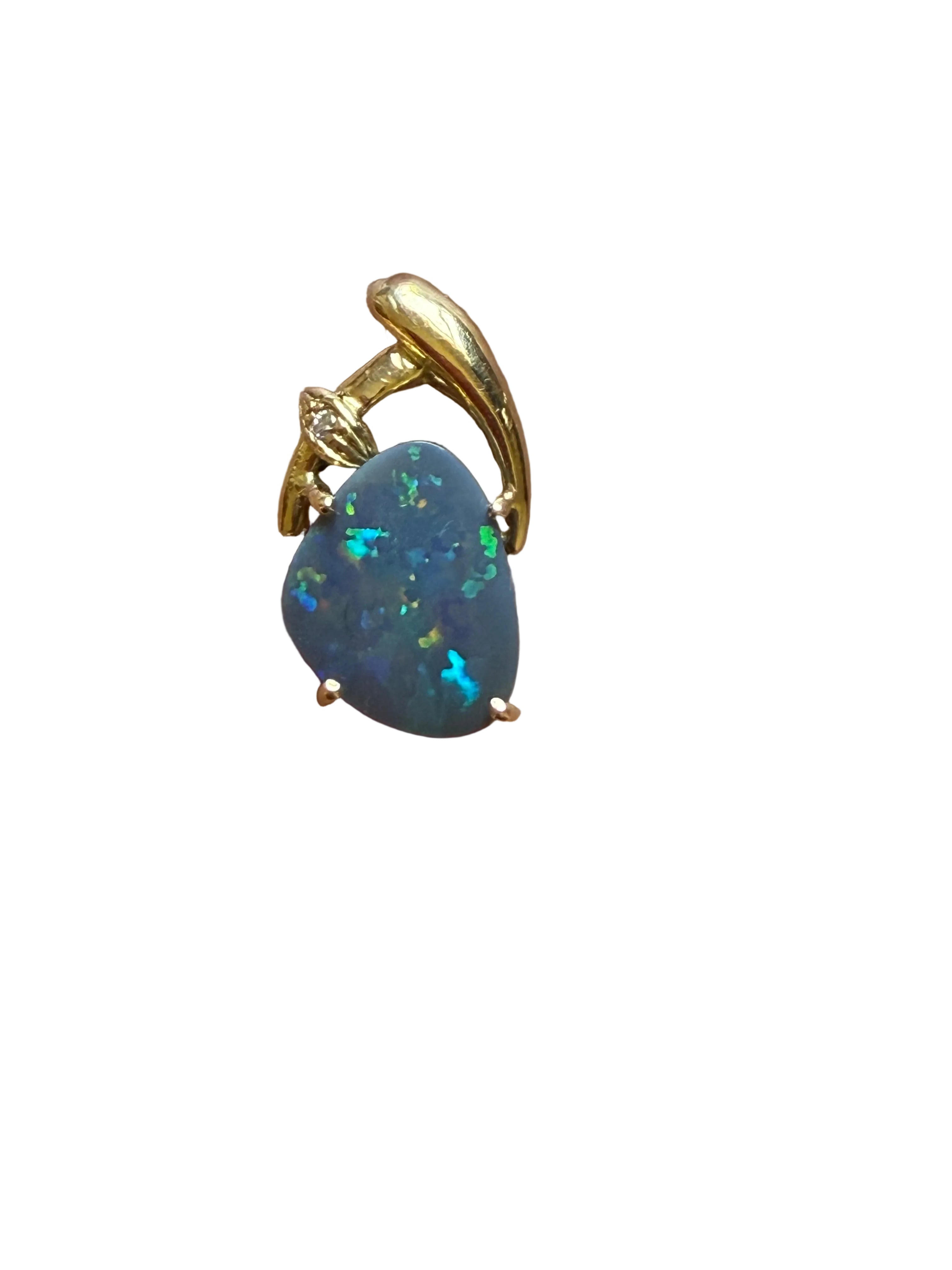 A truly exceptional modern opal design crafted by Creative Jewelry, featuring a premium natural Australian Black Opal displaying a vivid, captivating play-of-color and a beautiful natural pattern. Set in solid 18K yellow gold with a stamped hallmark, this piece radiates elegance. Completed with a brilliant cut genuine diamond and service chain, this pendant is a refined luxury collectible.