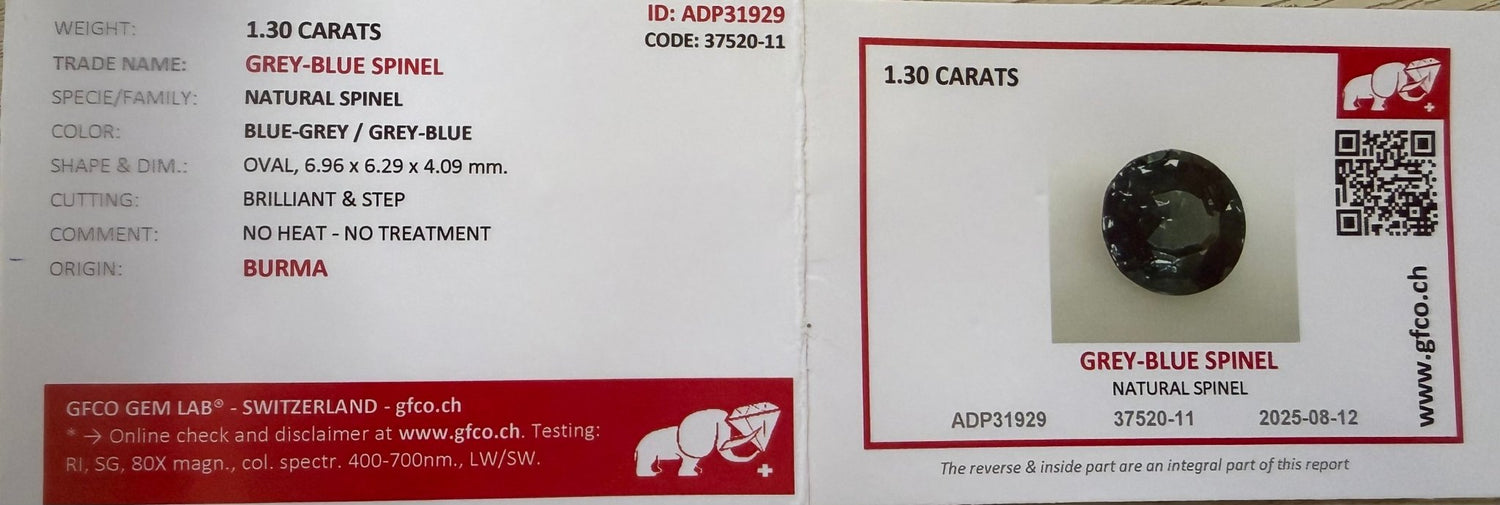 Discover the elegance of this 1.30-carat Natural Grey-Blue Spinel from the legendary mines of Burma (Myanmar). This gemstone features a unique and refined grey-blue color, excellent transparency, and a beautifully executed faceted oval cut.